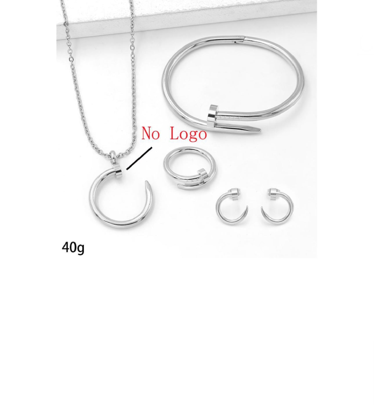 Complete set includes matching earrings, adjustable ring, bangle and necklace with nail pendant. Material is of stainless steel.