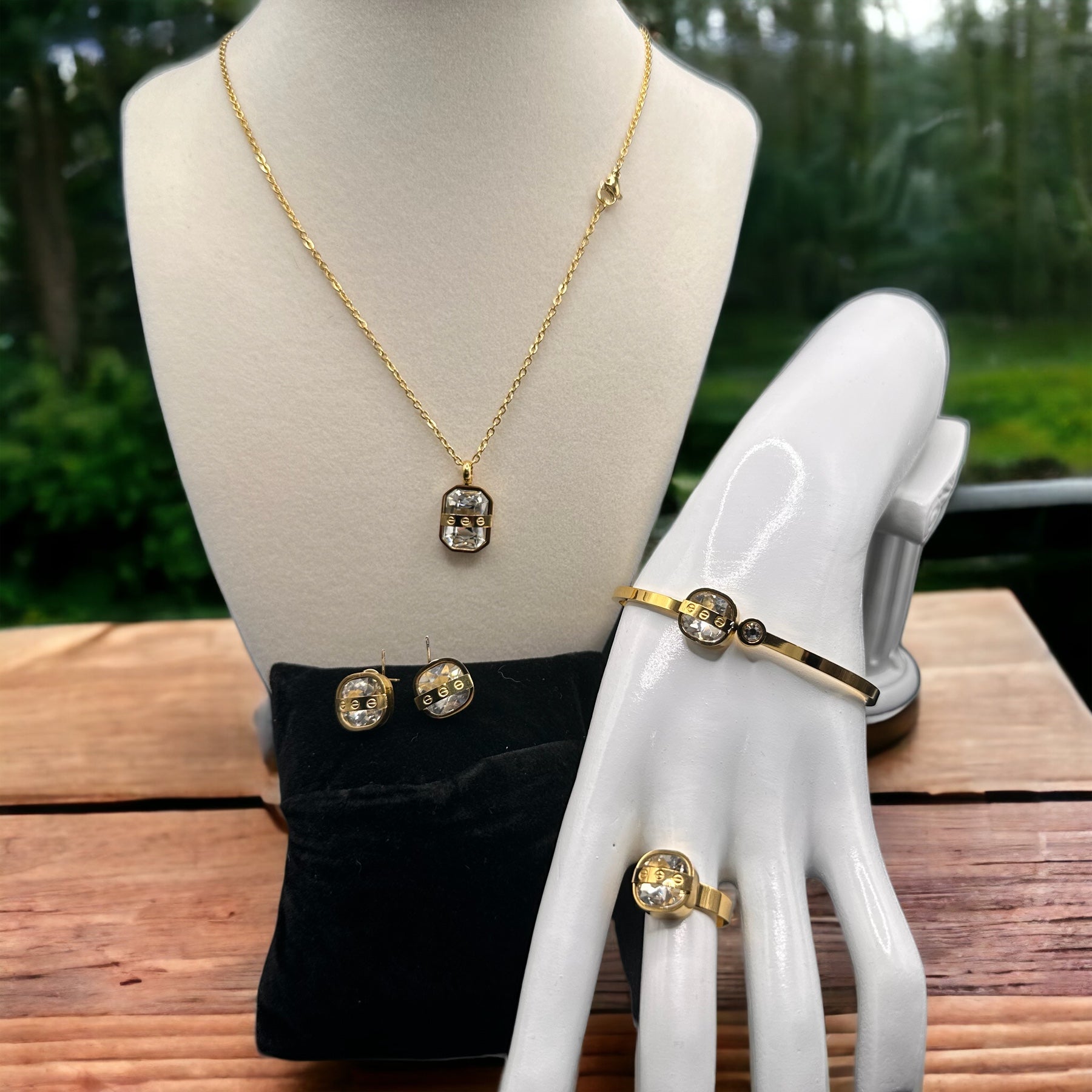 This beautiful set comes with an 18-inch necklace, bangle, adjustable ring and earrings. Stainless steel.