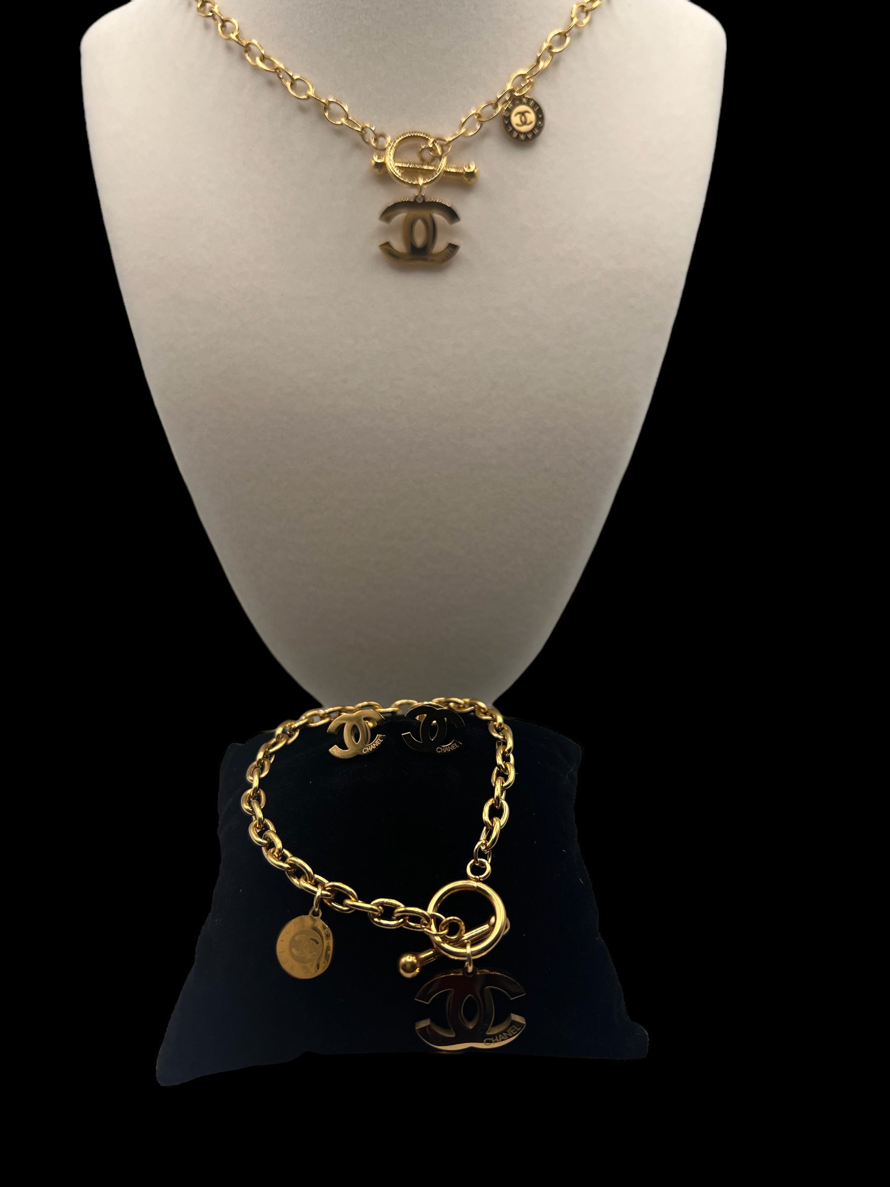Stainless steel yellow 12-inch toggle necklace with Coco pendant, stud earrings, and toggle bracelet with a charm.