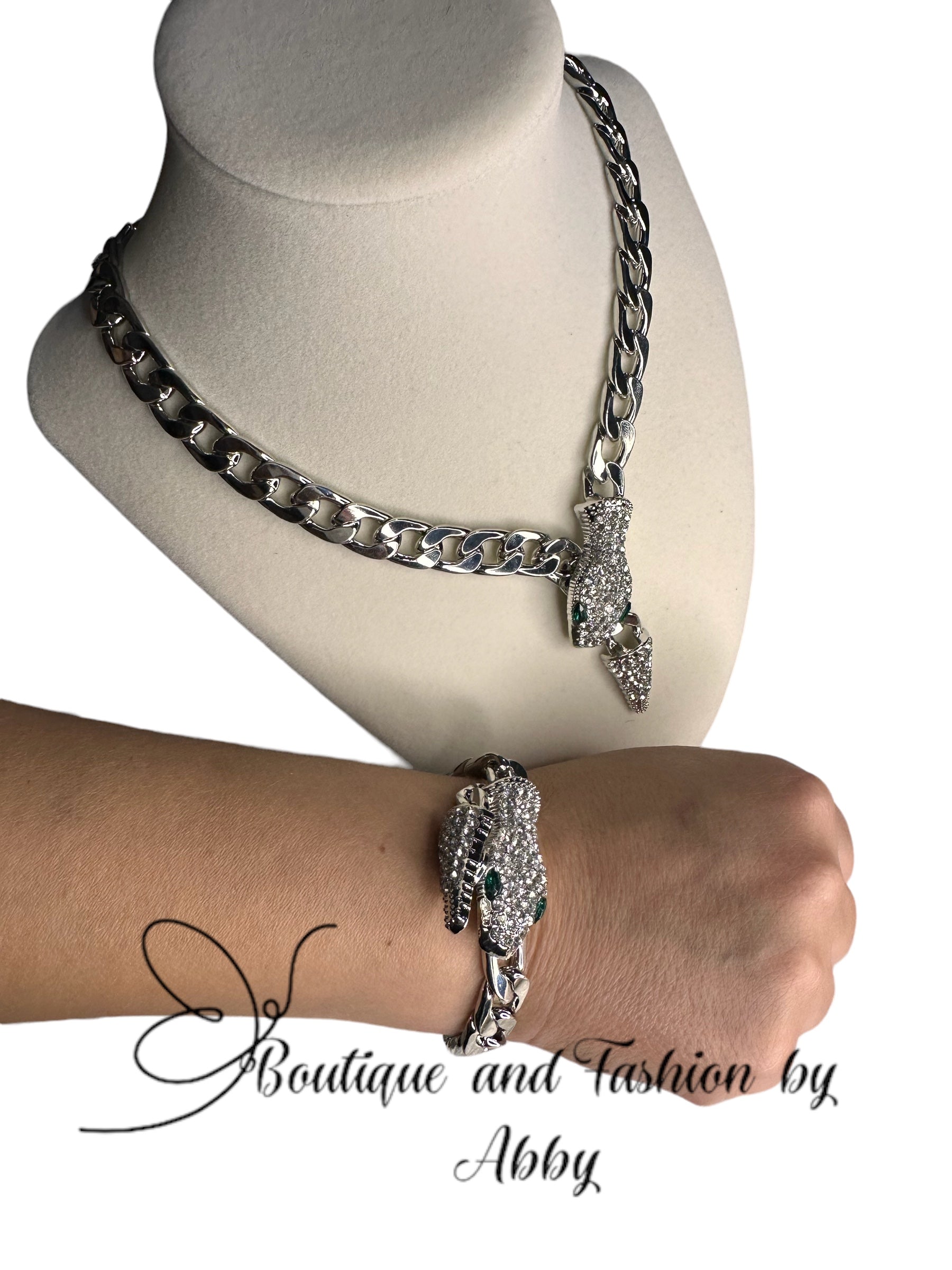 Stainless steel 18-inch Cuban link chain and 9-inch matching Cuban link bracelet. Serpent’s head and end tail has white CZ rhinestones and Green emerald rhinestone eyes