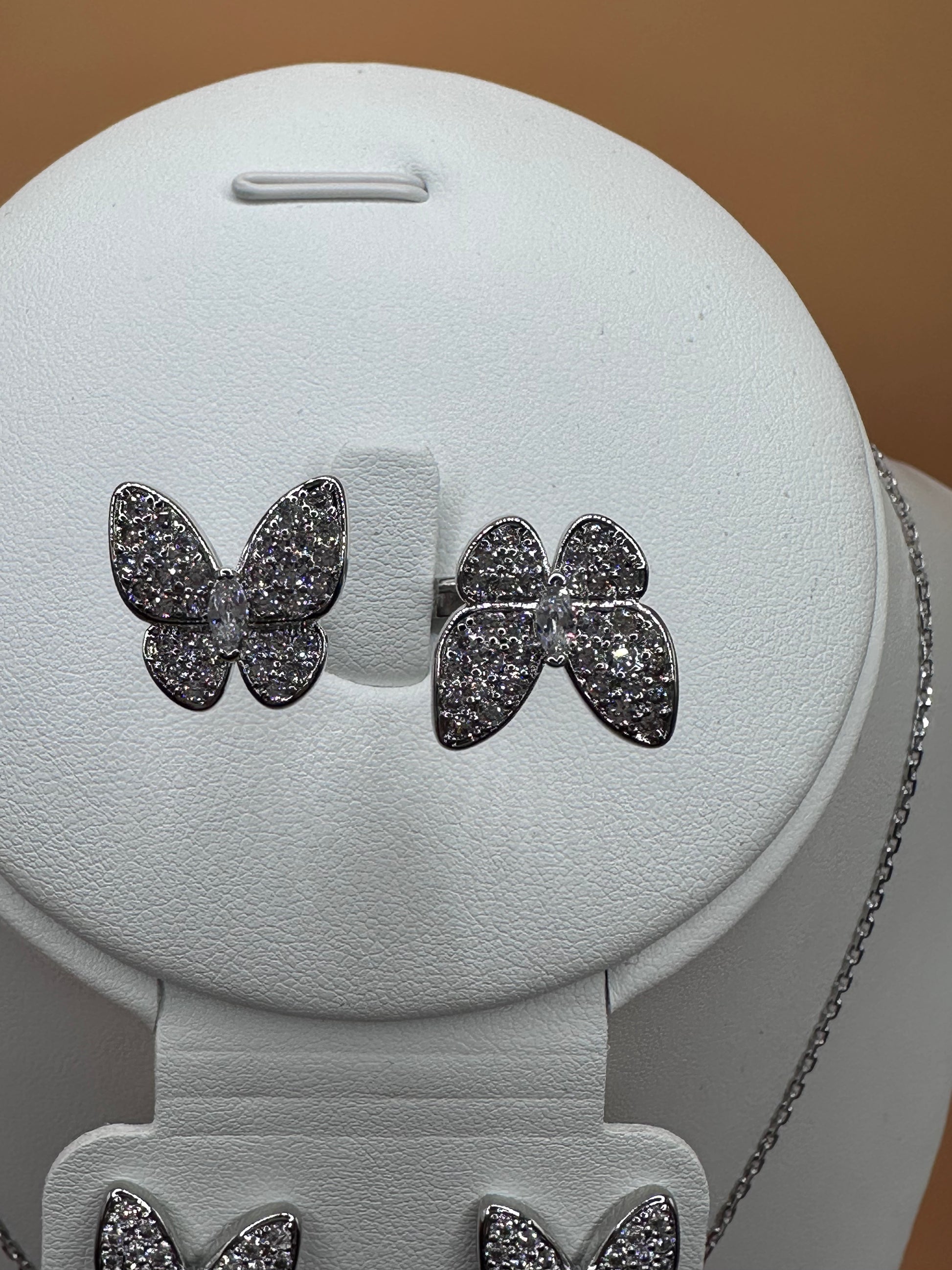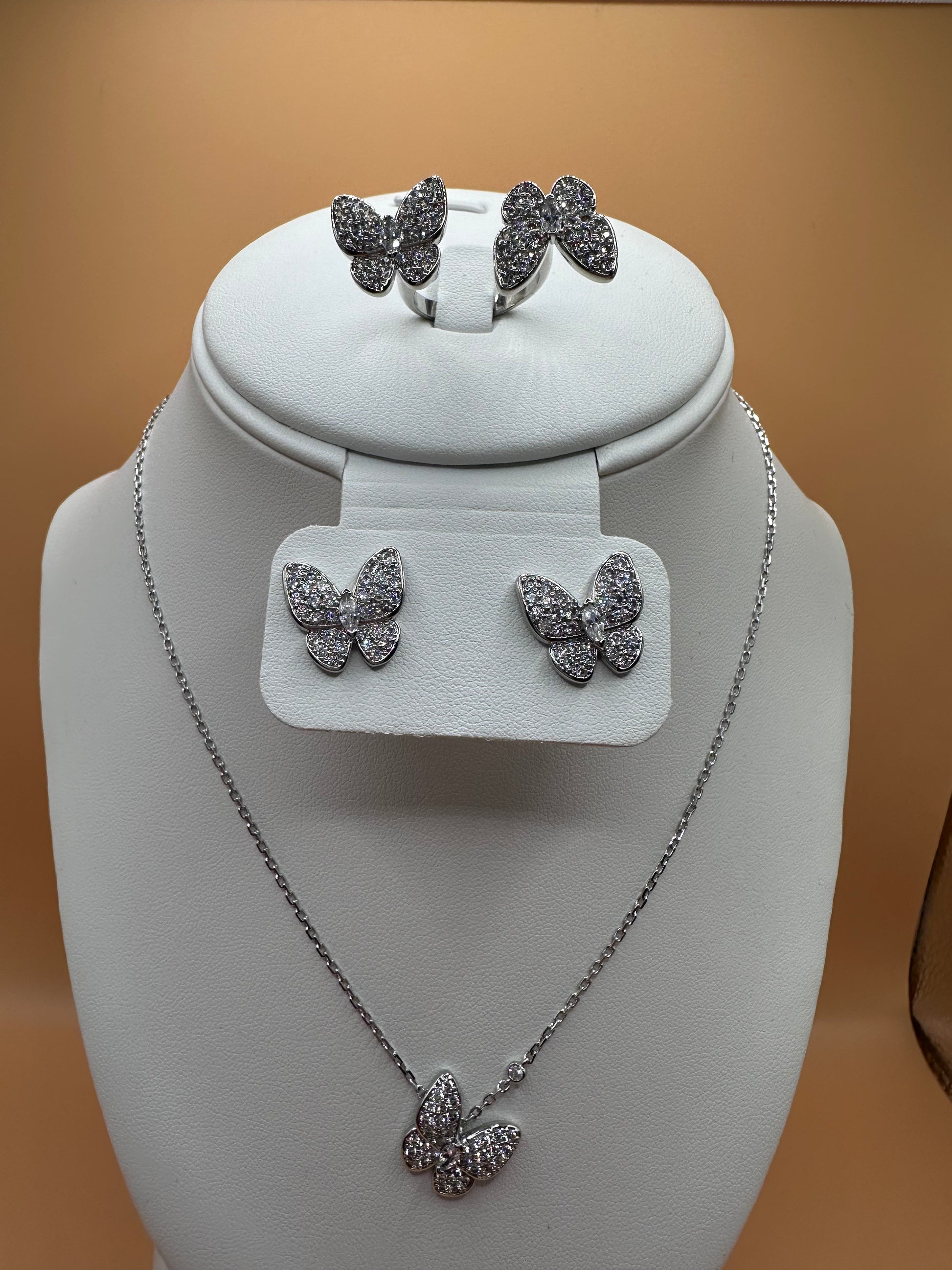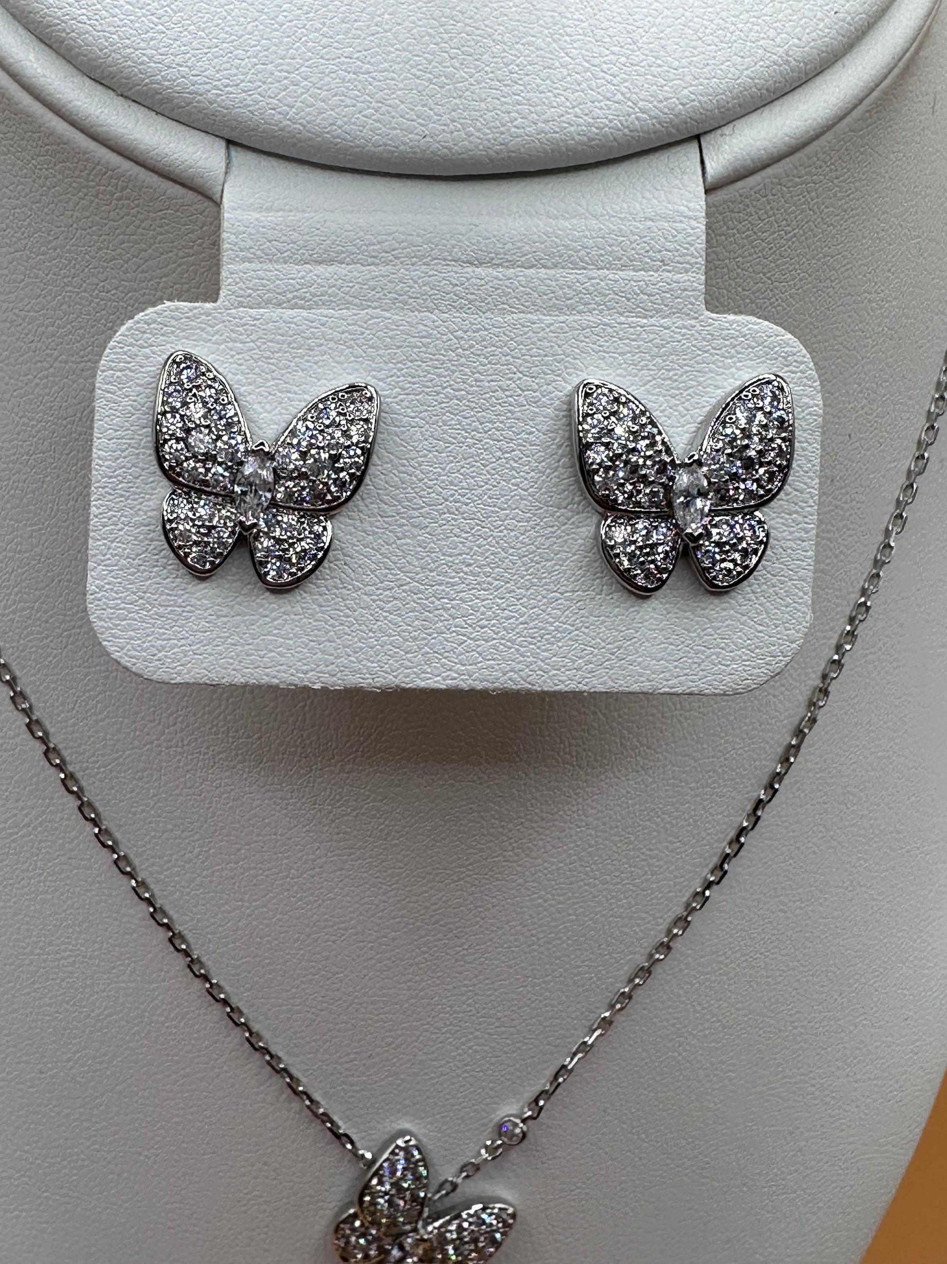 This set includes necklace with a butterfly pendant. Butterfly push-back stud earrings and a between ring with two butterflies all stainless steel and white rhinestones and engraved.