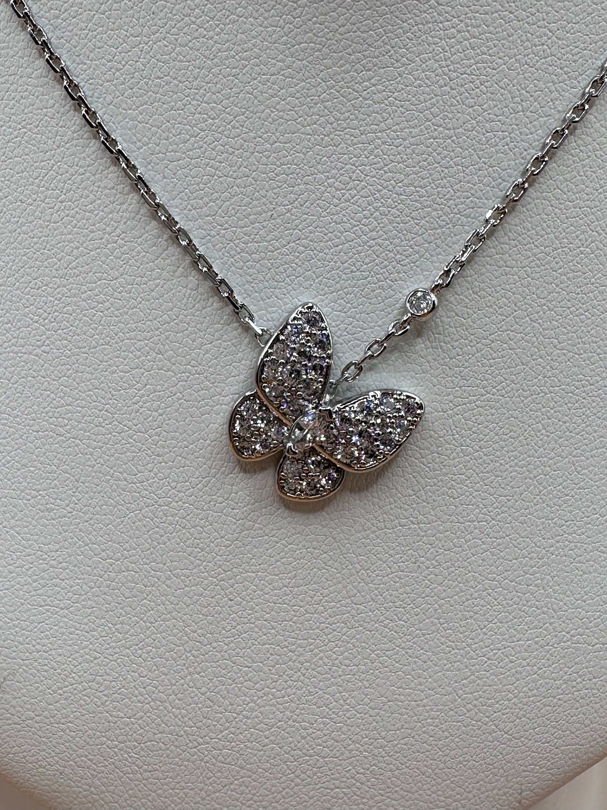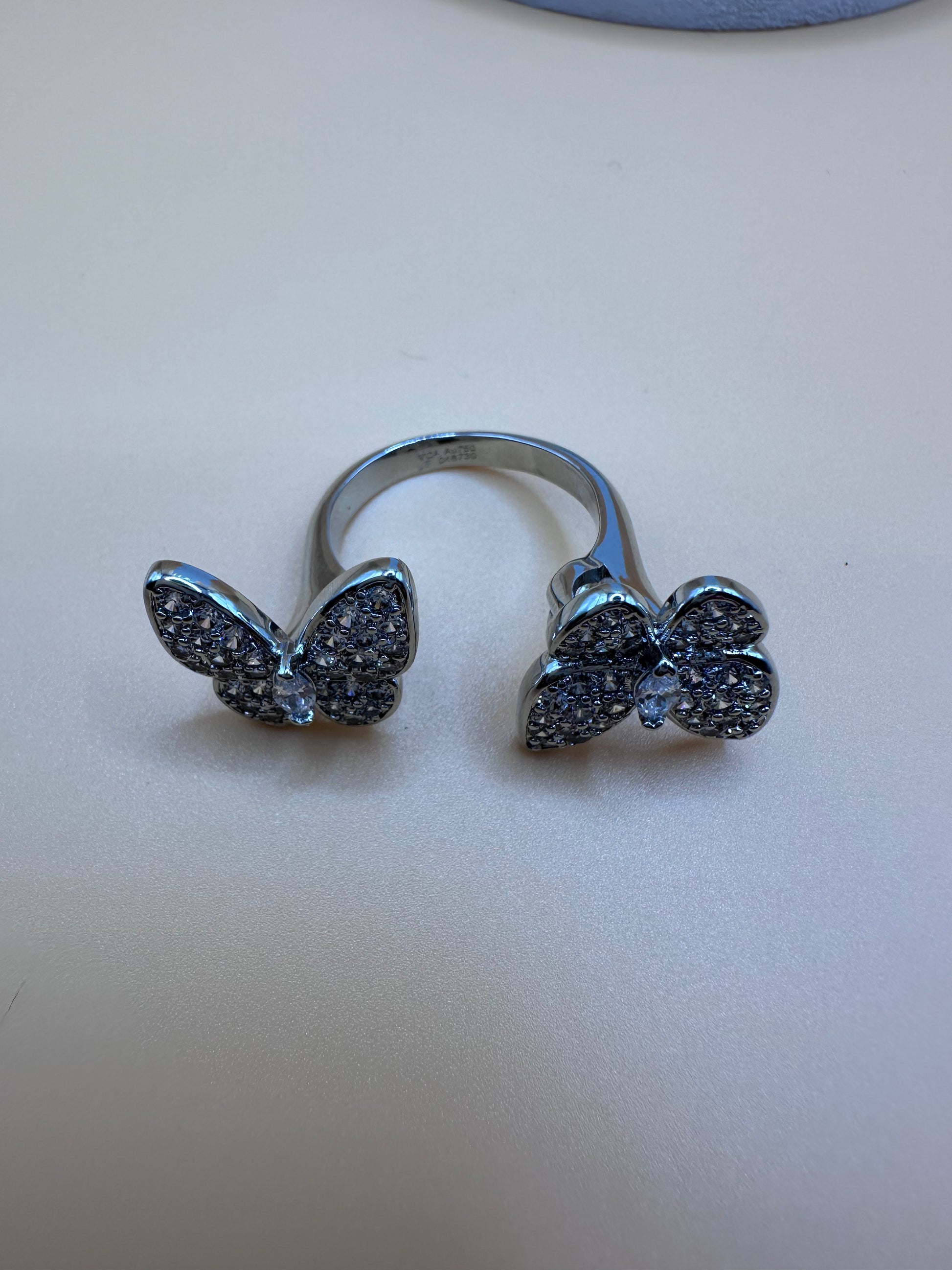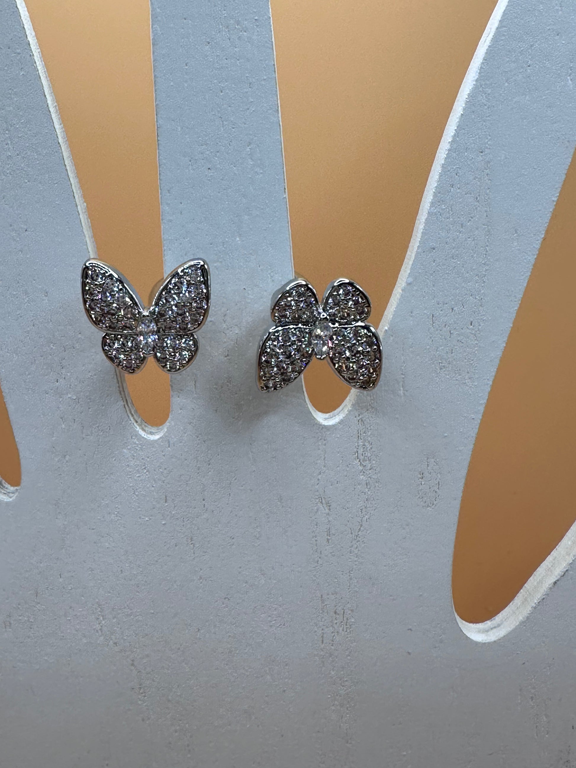 This set includes necklace with a butterfly pendant. Butterfly push-back stud earrings and a between ring with two butterflies all stainless steel and white rhinestones and engraved.