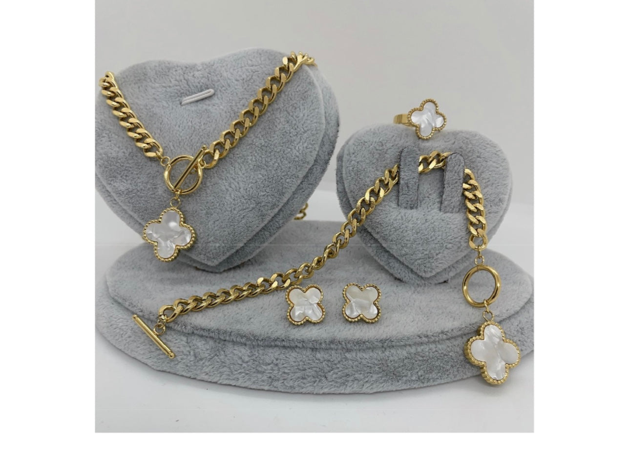 White Four Clover Set with toggle necklace and bracelet. Includes matching earrings and adjustable ring. Material is of stainless steel.